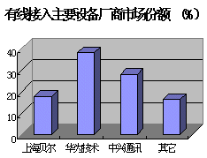 。2)市場特點:窄帶接入仍然是有線接入市場的主流,以Honet、ZXA10為代表的窄帶有線接入占市場90%以上的份額。xDSL、HFC、LMDS、千兆以太網(wǎng)技術(shù)等寬帶接入雖然熱浪涌動,但限于種種原因尚未大規(guī)模商用。中興通信、華為技術(shù)、上海貝爾穩(wěn)居有線窄帶接入市場三甲地位,市場份額之合占市場總量的83.6%。各自市場份額依次為27.8%、38.0%、17.8%。無線市話接入設(shè)備市場基本是UT斯達康、青島朗訊、中興通訊等幾家公司的天下,市場份額之合占市場總量的86.4%,各自市場份額依次為32.6%、24.3%、29.5% 。