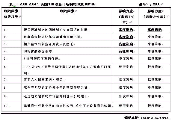 美國的WIN市場盡管處于強勢發(fā)展過程中,但這其中的變數也是有的。根據Frost & Sullivan 資料,2000-2004年間制約該市場發(fā)展的主要因素與影響力度見表二: