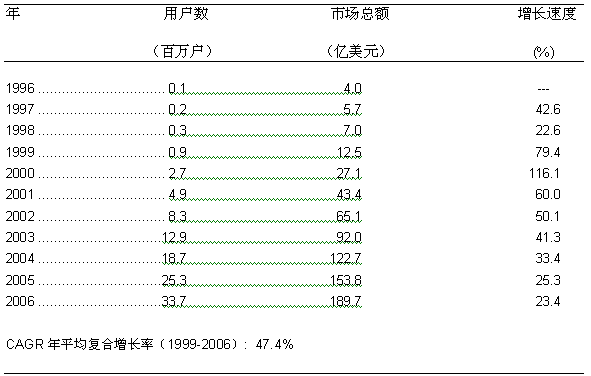 圖一: 美國(guó)寬帶接入服務(wù)市場(chǎng)的增長(zhǎng)歷史和預(yù)測(cè) 1996-2006