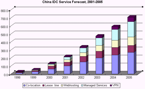 Frost & Sullivan研究表明,在2000年,中國IDC市場規(guī)模約為1億2千萬美圓,預測到2005年,將達到7億美圓。從2000年到2005年間,中國IDC市場的年平均復合增長率將達42.3% 。