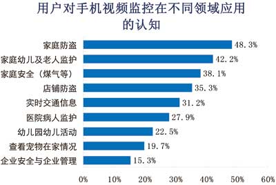 諾達(dá)咨詢調(diào)查數(shù)據(jù)表明,分別有48%、42%和38%的用戶認(rèn)為手機監(jiān)控可以應(yīng)用于家庭防盜和家庭幼兒及老人監(jiān)管以及家庭安全,其次,有30%-35%的用戶認(rèn)為手機監(jiān)控可以應(yīng)用于店鋪防盜、交通信息的實時發(fā)布。有28%的用戶認(rèn)為手機監(jiān)控可以應(yīng)用于醫(yī)院病人監(jiān)護。另外,有不到25%的用戶認(rèn)為,手機監(jiān)控可以應(yīng)用于孩童在幼兒園活動的監(jiān)看、寵物在家情況監(jiān)看和企業(yè)安全與管理。