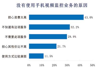 諾達(dá)咨詢對沒有使用手機視頻監(jiān)控的用戶原因進行調(diào)查,結(jié)果表明,43%的用戶擔(dān)心資費太高,其次對手機監(jiān)控不了解和不需要此項服務(wù)的用戶各占32%、30%。22%的用戶擔(dān)心性價比不高,12%用戶因為使用比較麻煩而不選擇手機視頻監(jiān)控服務(wù)。