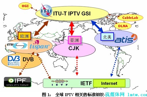 當前,全球范圍內有多個國際和地區(qū)標準化組織都在開展IPTV相關的標準和技術規(guī)范制定與推廣工作,主要集中在歐洲、北美和亞洲(中、日、韓,CJK)。各主要組織及其相互關系如圖1所示。