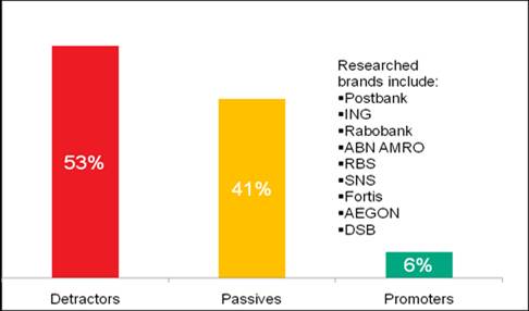 Research 以德國消費(fèi)者為樣本的調(diào)研表明大多數(shù)客戶是其金融服務(wù)提供商的批評(píng)者(見圖1)。整體的凈推薦分?jǐn)?shù)為-47% (6%的人推薦,- 53%的批評(píng)者)。該研究囊括了荷蘭幾大知名品牌。