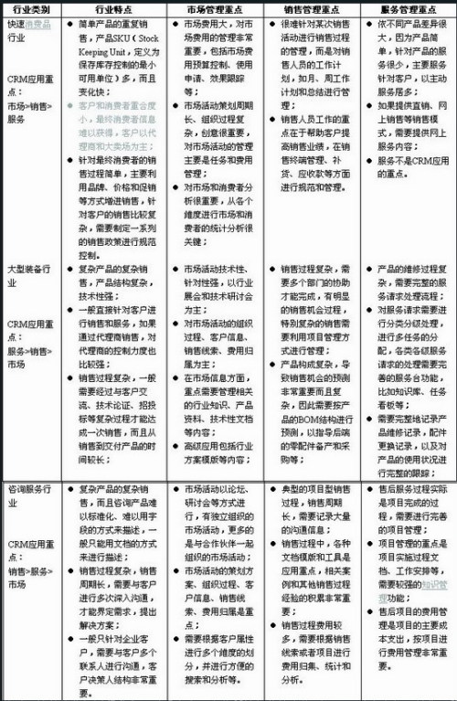 從以上簡單的分析過程我們可以看出由于企業(yè)所處行業(yè)特點(diǎn)的不同,導(dǎo)致在市場、銷售和服務(wù)方面對CRM主要功能需求差別非常大。企業(yè)在實(shí)際選型過程中,還需要對行業(yè)再進(jìn)行細(xì)分分析,比如在快速消費(fèi)品中,洗滌用品行業(yè)和牛奶乳業(yè)行業(yè)在客戶服務(wù)的主要需求等方面就有比較大的差別,這些都需要細(xì)致的分析。